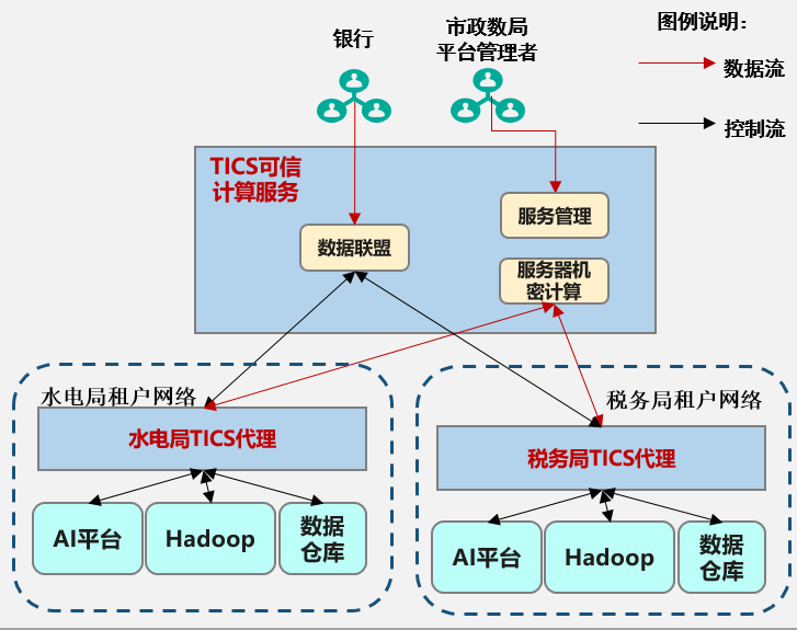 以下面这个场景为例, 银行可能希望获取水电局和税务局的数据,来综合计算得到各公司的信贷评分等级。