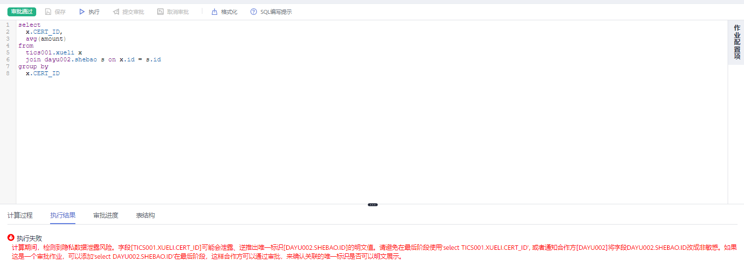 - 如果作业结果可能泄露审批中确认为“不可见”的敏感字段,则会被检测出来,提示发起方修改sql补充更完善的审批信息。
