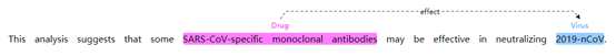知识图谱构建的核心是知识建模工作,而知识建模的核心是信息抽取算法及模型。信息抽取的目的是通过算法模型完成三元组的自动抽取,如图2所示,在科研文献中,抽取“SARS-CoV-specific monoclonal antibodies“-“effect”-“2019nCoV”这种形式的三元组结果,即Drug-effect-Virus类型三元组。