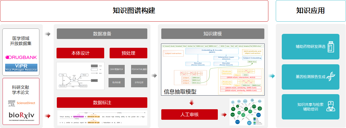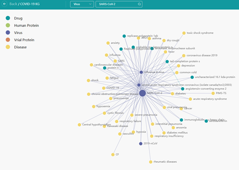 随着疫情的发展,医学研究人员迫切需要能够系统梳理和整合新型冠状病毒的相关知识,加速对新冠病毒的机制研究及抗病毒药物研发筛选。例如,新冠病毒所属的病毒族系是什么,新冠病毒的重要属性有哪些,抗病毒药物与病毒靶点之间的关系是什么,以及病毒亲缘关系等。以上这些知识存在于众多的知识库或者最新发表的学术文献中,很难被科研人员系统的检索和使用。