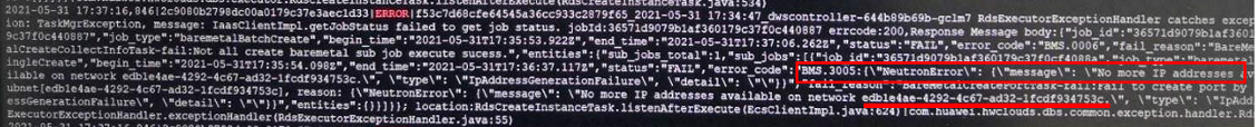 1.报错信息如下,查看有关键字,BMS.3005 No IP addresses available on network xxxx,其中xxxx网络id,可以在serviceOM中查看具体的网络,算出ip不足,只有61个ip,但是当节点超过时则没有ip资
