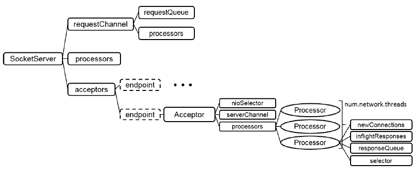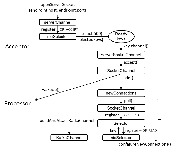 - 按照 endpoint 顺序初始化 Acceptor,每个 endpoint 对应一个 Acceptor,为每个 Acceptor 创建 Processor(数量由 num.network.threads 配置项决定),并启动 Acceptor,Acceptor 启动后会通过 selector 监听连接,并将新建立的连接交给 Processor 处理(轮询选择 Processor)