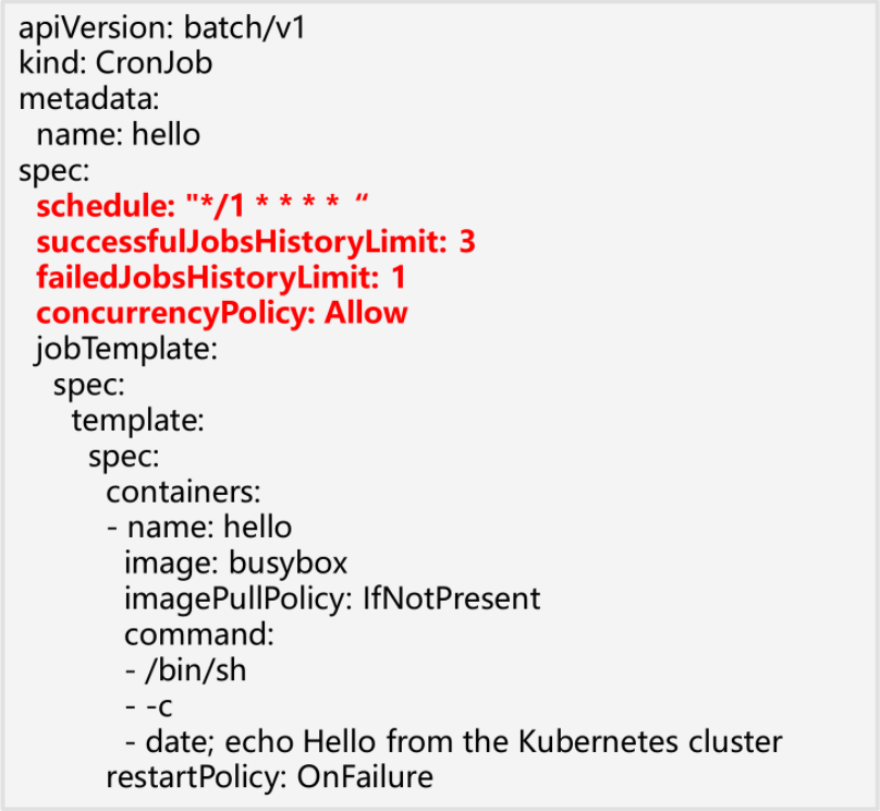 ConcurrencyPolicy:指定CronJob 创建的任务执行时发生重叠如何处理, Allow是允许并发执行任务, Forbid是不允许并发执行,Replace是会用新任务替换正在运行的任务。