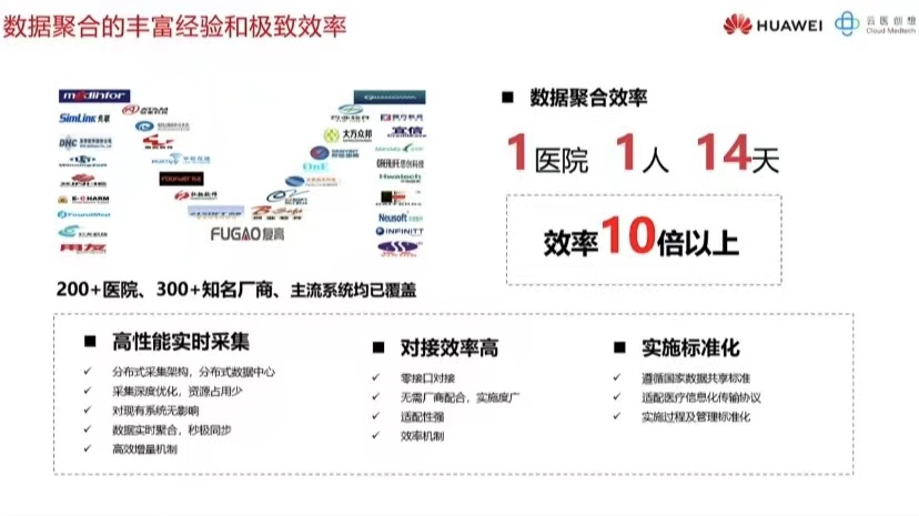 数据聚合已经覆盖了200多家医院,300多家知名厂商以及所有主流系统。例如,在医院场景中应用时,它不需要业务系统厂家配合开接口,医院信息只需提供数据的只读账号,云医创想就可以做到1家医院,1个人,14天就完成平台的部署调试。目前处于国内最快水平,数据质量也是最好的。此外,云医数据采集不会对医院现有的业务系统造成压力,同时还可以做到分钟级的同步,每次同步时间在几秒钟之内,这样能为后续诊疗协作场景提供最高的协作效率。而且平台完全符合医疗信息化的安全要求,聚合整理后的数据符合国家医疗信息计划的标准,并且符合电子病历等一些评审的要求。