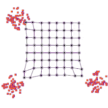 - SOM的目标是用低维(通常是二维或三维)目标空间的点来表示高维空间中的所有点,尽可能地保持点间的距离和邻近关系(拓扑关系).
