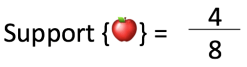 支持度表达的是物品的"流行度",用下面的图例来看,支苹果的持度则是苹果在8次交易中出现的概率