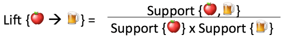 置信度表示当事件X出现后,事件B出现的概率,下面的图例中的意思是已知苹果已被购买,购买啤酒的额置信度公式