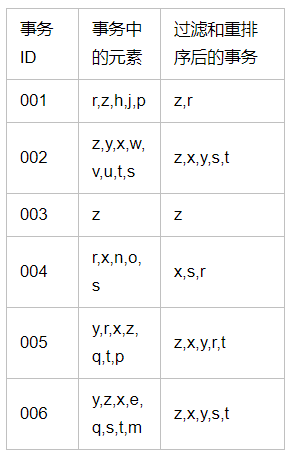 结合绘制的带头指针表的FP树,对表中数据进行过滤,排序如下: