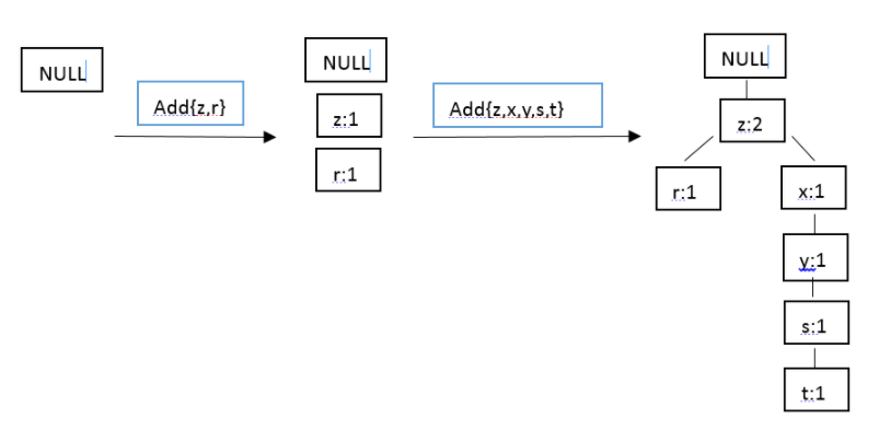 在对数据项过滤排序了之后,就可以构建FP树了,从NULL开始,向其中不断添加过滤排序后的频繁项集。过程可表示为: