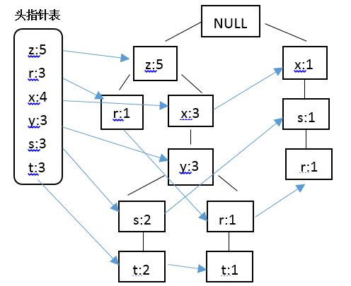 FP表示的是频繁模式,其通过链接来连接相似元素,被连起来的元素可以看成是一个链表。将事务数据表中的各个事务对应的数据项按照支持度排序后,把每个事务中的数据项按降序依次插入到一棵以 NULL为根节点的树中,同时在每个结点处记录该结点出现的支持度。