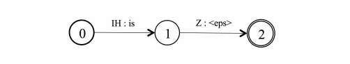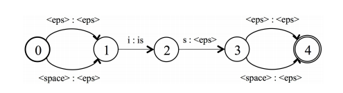 第一个例子展示了音素词典的构建,假如音素词典的条目为“is IH Z”,下面的一个例子展示了拼写词典的构建,“is i s”。对于拼写词典,有另一个复杂的问题需要 处理,当以character为CTC的标签时,我们通常在两个word间插入一个额外的空格(space)去建模原始转写之前的单词间隔。在解码的时候,我们允许空格选 择性地出现在一个单词的开头和结尾。这种情况能够很轻易地被WFST处理。