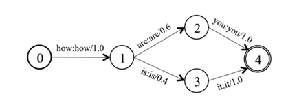 - 语法(Grammar). 一个语法WFST编码了语言允许的单词序列。上图是一个精简的语言模型。它有两条序列:“how are you”和“how is it”。WFST的基本符号单位是word,弧上的权重是语言模型的概率。利用这种WFST形式的表示,CTC解码原则上可以利用任何能被转换成WFST的语言模型。按照Kaldi中的表示方式,这个语言模型的WFST被表示为G。