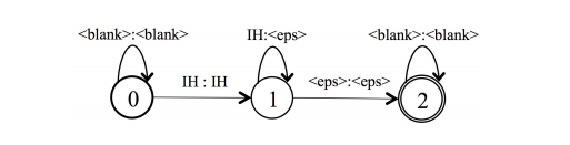 3. 令牌(token). 第三个WFST将帧级别的CTC标签序列映射到单个词典单元(音素或者character)上。对一个词典单元,token级的WFST被用来归入所有可能 的帧级的标签序列。因此,这个WFST允许空白标签∅的出现,以及任何非空白标签的重复。举例来说,在输入5帧之后,RNN模型可能输出3种标签序列: “AAAAA”,“∅∅AA∅”,“∅AAA∅”。Token wfst将这三个序列映射到一个词典单元:“A”上。下图展示了一个音素“IH”的WFST,这个图中允许空白<blank>标签的出 现,以及非空白标签“IH”的重复出现。我们将这个token的WFST表示成T。