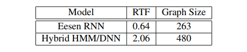 Eesen的一个显著的优势是,相较于混合的HMM/DNN模型,解码速度大大加快了。这种加速来源于状态数量的大幅减少。从下表的解码速度可以看出来,Eesen获取了3.2倍以上的解码速度加速。并且,在Eesen模型中用到的TLG图,也明显小于HMM/DNN中用到的HCLG图,这也节约了用于存储模型的磁盘空间。