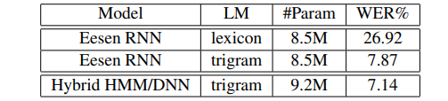 上面介绍了基于WFST的方法,我们接下来来看一下实验部分。在进行后验分布正则之后,这个声学模型的分数需要被缩小,缩放因子在0.5~0.9之间,最佳的缩放值通过实验决定。本文的实验是WSJ上进行的。本文使用的最佳模型是一个基于音素的RNN模型,在eval92测试集上,在使用词典与语言模型时,这个模型达到了7.87%的WER,当只用词典时,WER快速升高到了26.92%。下图展示了本文的Eesen模型与传统hybrid模型的效果对比。从这个表中,我们可以看到Eesen模型比混合的HMM/DNN模型较差一些。但是在更大的数据集上,比如Switchboard,CTC训练的模型能获得比传统模型更好的效果。