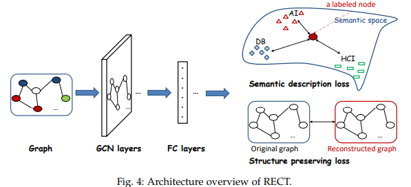 作者提出了两套模型:RSDNE和RECT。RSDNE主体部分基于DeepWalk的矩阵分解模型,并且在这个基础上加入了两项自定义的loss:同类节点的相似性和不同类节点的不相似性,两者同样采用的矩阵形式实现。作者在训练策略上也做了一些设计,DeepWalk的矩阵分解形式的优化参数包括节点嵌入矩阵U和上下文表示矩阵H,而作者在定义同类节点的相似性loss时引入节点近邻矩阵S,于是作者交替优化这三个参数矩阵来达到优化三个loss的目的。RECT的主体部分是基于GCN的,然后作者在GCN的输出基础上加入了一层全连接后,将节点表示再通过DeepWalk的矩阵分解模型得到更新后的节点表示,当时作者并没有想到很好的方案将这两个训练过程迥异的方案结合起来,最后还是分开训练,先训练GCN,在训练矩阵分解,最后将GCN和矩阵分解的结果合起来作为节点的最终表示。