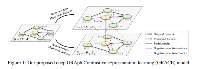 这篇文章的基本思路和上一篇基本一致,都是生成两个不同的视图,然后约束两个视图中节点表示“相近”,从而无监督地得到节点的Encoder。不同之处在于,这篇文章使用移除边(Removing edges)和掩盖节点特征(Masking node features)两种手段,生成了两个“损坏”的视图。并且提出了一种独特的损失函数计算方式,作者也花了很大的篇幅介绍他提出的损失函数与互信息损失函数(Mutual Information)和三元损失函数(Triplet Loss)的关系。这篇比较偏理论,提出的方法也都尽量与已有方法靠了下边,给出了方法提出的“理由”。