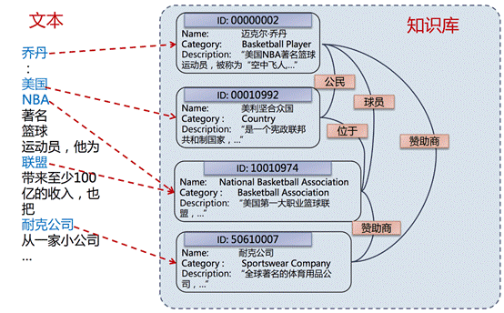 - 链接式:需要在实体类抽取式的基础上,对抽取得到的实体做融合消岐、链接到给定知识库或知识图谱当中。典型的应用如图6中所示的实体链接。