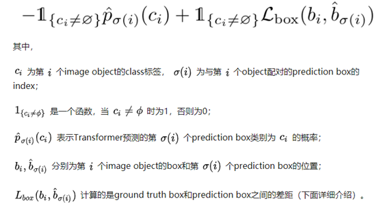 Transformer的Decoder输出了N个object proposal ,我们并不知道它和真实的Ground truth的对应关系,因此需要经二分图匹配,采用的是匈牙利算法,得到一个使的匹配loss最小的匹配。匹配loss如下: