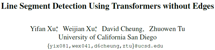 [1] Yifan Xu, Weijian Xu, David Cheung, Zhuowen Tu. Line Segment Detection Using Transformers without Edges. Proceedings of the International Conference on Computer Vision and Pattern Recognition. 2021, 4257-4266.