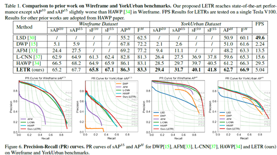 图4、线段检测方法在两种数据集上的性能指标对比(Table 1);线段检测方法的PR曲线(Figure 6)