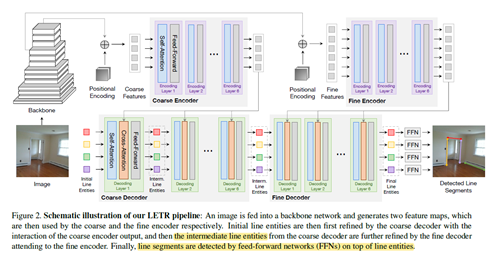 从上图中可以看出LETR包含了两个Transformer。作者称此为a multi-scale Encoder/Decoder strategy,两个Transformer分别称之为Coarse Encoder/Decoder,Fine Encoder/Decoder。也就是先用CNN backbone深层的小尺度的feature map(ResNet的conv5,feature map的尺寸为原图尺寸的1/32,通道数为2048) 训练一个Transformer,即Coarse Encoder/Decoder,得到粗粒度的线段的特征(训练的时候固定Fine Encoder/Decoder,只更新Coarse Encoder/Decoder的参数)。然后把Coarse Decoder的输出作为Fine Decoder的输入,再训练一个Transformer,即Fine Encoder/Decoder。Fine Encoder的输入是CNN backbone浅层的feature map(ResNet的conv4,feature map的尺寸为原图尺寸的1/16,通道数为1024),比深层的feature map具有更大的维度,可以更好的利用图像的高分辨率信息。
