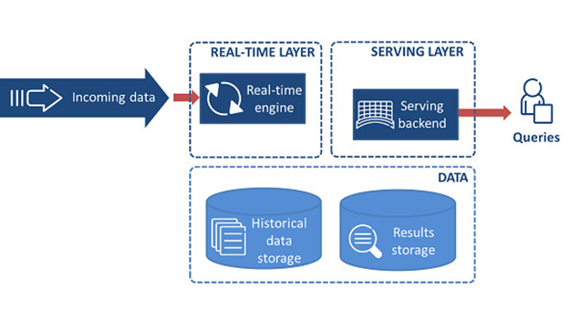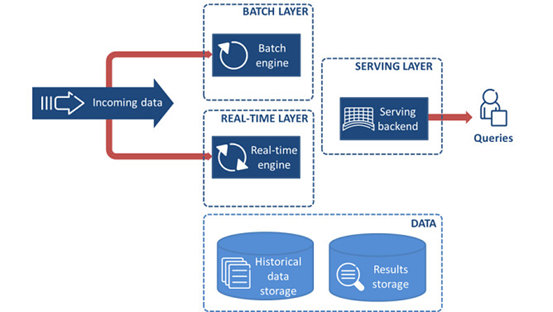 数据流一分为二,每个数据样本都会同时发给离线层和加速层。所有进入离线层的数据流被数据湖中基于内存的数据库或NoSQL类数据库永久的存储下来,之后离线层会使用如MapReduce、Spark或一些机器学习方法对数据进行处理并由此对接下来的内容进行预测。