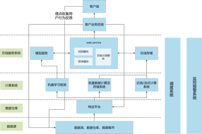 上图展示的是音视频行业根据用户行为(浏览、观看、点击、收藏、评论、购买等),依托数据湖及Lambda架构进行千人千面音视频推荐的推荐系统架构。日志数据通过客户端的埋点进行收集并存储在数据湖中,经过清洗的数据流分别进入批、流处理系统分别进行模型的训练和基于当前模型的对于实时数据的推理预测处理,批、流处理后的数据上报给客户业务后端,其作为整体框架的服务层将推荐结果统一推送给客户端,完成客户端的推荐业务。