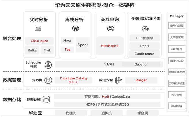 数据存储层基于云原生架构,通过对象存储服务OBS统一管理湖&仓,实现湖仓共享存储资源池,针对同一份元数据定义支持各种场景,提供API方便各类工具和引擎直接访问数据。