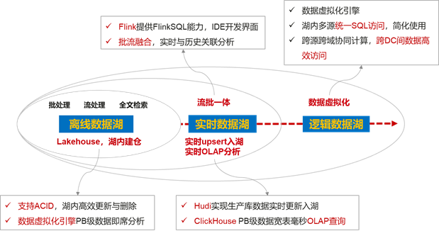 传统数据湖主要以离线批量计算为主,因此不支持数据仓库的数据管理能力,难以提高数据质量;数据入湖时效性差,不支持实时更新,数据无法强一致性;主题建模不友好,无法直接通过历史数据拉链建模;同时交互分析通常将数据搬迁到数据仓库平台,造成分析链路长,数据冗余存储;批、流等场景融合不够,无法满足企业的海量数据诉求。