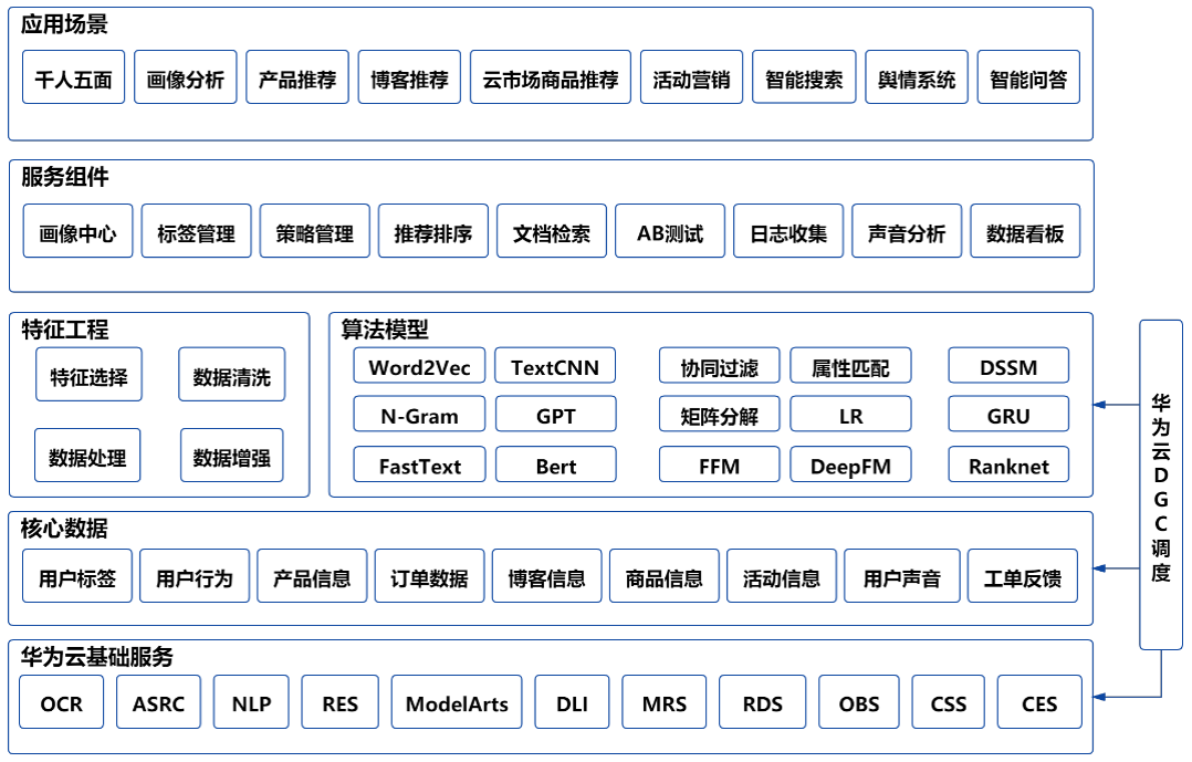 首先最底层为基础服务层,我们所有业务都是基于华为云服务构建,包括AI相关的OCR、ASRC、NLP、RES、ModelArts,大数据相关的DLI、MRS等,以及基础的SQL和NoSQL存储服务;在基础服务层上面的是核心数据层,包括用户画像、行为数据,物品信息等数据;中间层是我们的的特征工程和算法模型层,算法模型主要集中在NLP、智能推荐、智能搜索相关算法。再上层我们构建了服务组件用于支撑不同的业务场景,包括画像和标签组件、策略管理排序组件、AB测试和日志采集组件等;最顶端的上层应用场景主要有千人五面、推荐、搜索、舆情和智能问答等。