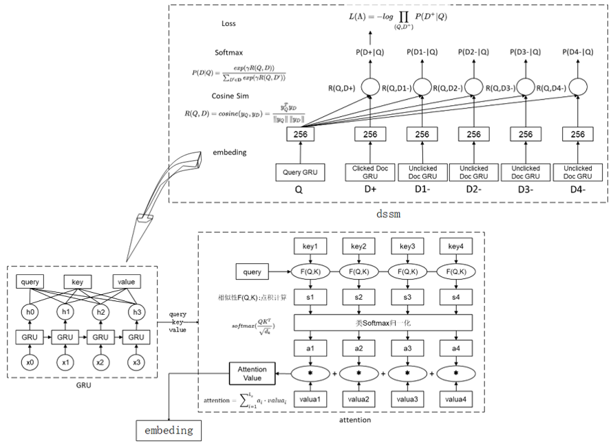 RNN-Attention-DSSM模型如下:最上层是典型的DSSM层,根据查询和正向、负向文档的向量距离计算语义相似度,并进行softmax。训练的目标是使得查询下正向文档的概率最高。下方左侧是个典型的GRU网络,右侧是典型的Self-Attention模型。