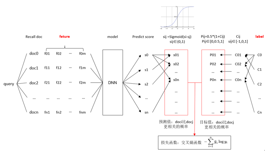 如上图,Ranknet算法流程为:左侧根据用户的查询和召回的文章提取特征,然后由一个DNN网络计算出每个文档的分词,再将文档的分值两两求差值,之后经过sigmoid函数将数值约束在(0,1)之间。