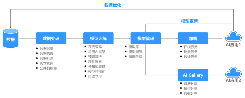 我们的工程化实践比较简单:基于华为云ModelArts一站式开发平台,构建数据处理、模型训练、模型管理、部署的能力,并基于DGC的定时调度,构建模型持续训练和发布的能力。