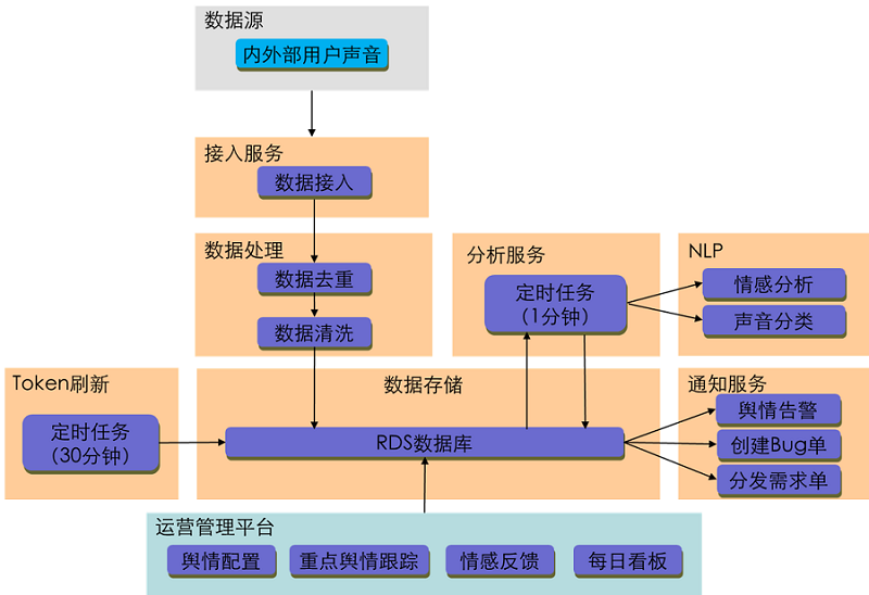 对用户体验问题的分析和改进,是产品体验持续改进的重要方式。我们主要利用NLP技术分析用户情感,并对体验问题进行分类和分发处理,相关逻辑视图如下: