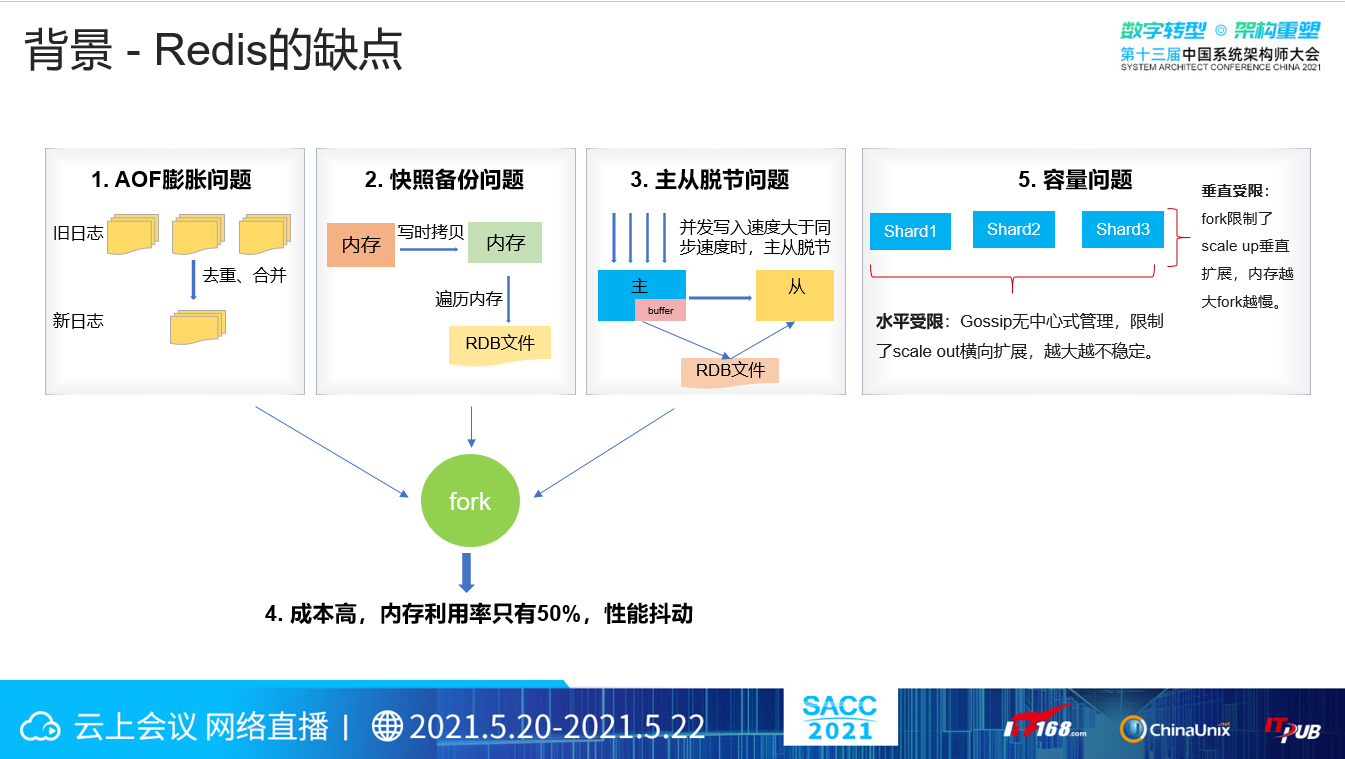 开源Redis不适合大规模使用,有两个重要因素限制了其扩展性。首先是fork限制了Redis的垂直扩展能力(Scale Up),数据量越大,fork越慢,对业务的影响就越大,因此单个redis进程可承载的数据量非常有限。其次,低效率的gossip集群管理限制了其水平扩展能力(Scale Out):因为节点数越多,其故障发现的时间越长,并且内部通信的网络风暴成几何级数增加,导致大集群几乎不可用。