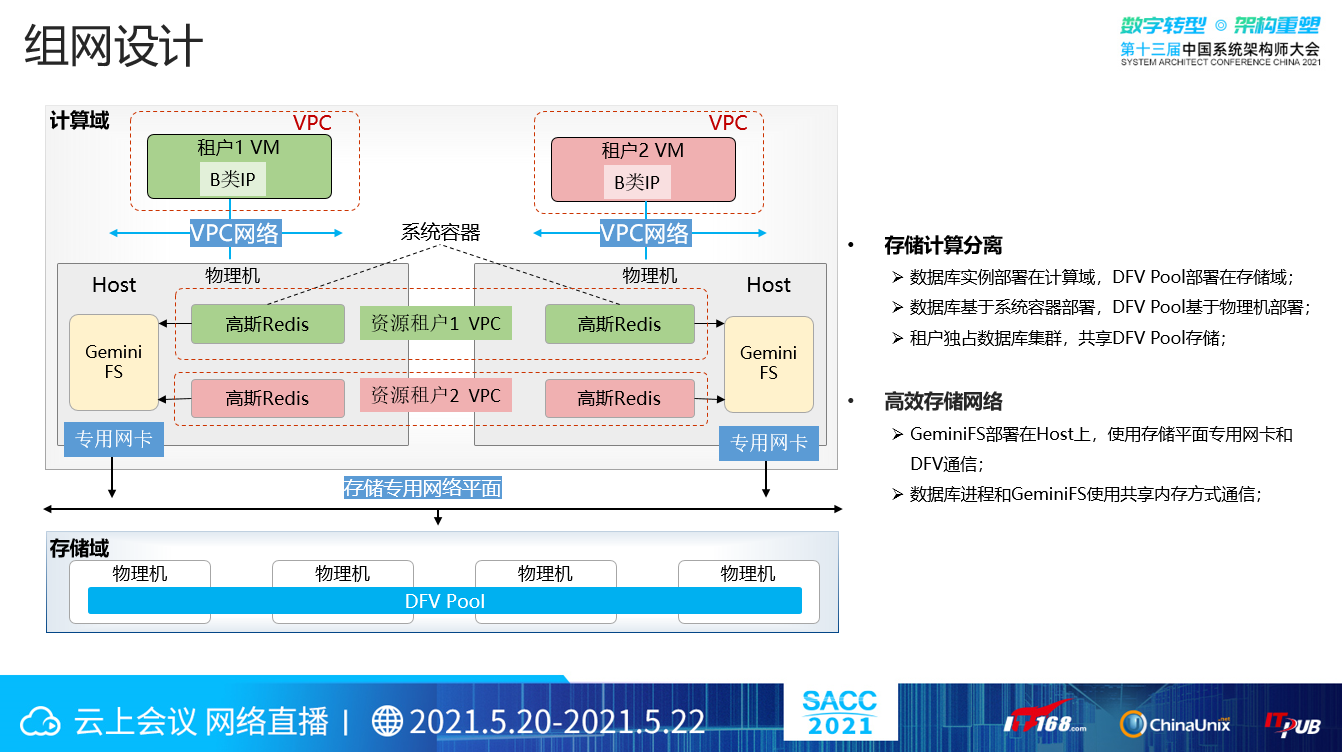 接下来是组网设计。一个租户申请的数据库资源,被我们以反亲和的方式,分布在不同的物理机容器上,都属于同一个租户的相同VPC下。不同用户的数据库资源虽然也有可能共享同一台物理机,但是由于VPC隔离,保证了数据隔离。另外,计算层的数据库资源是独占容器的,而存储层资源是共享物理硬件的。