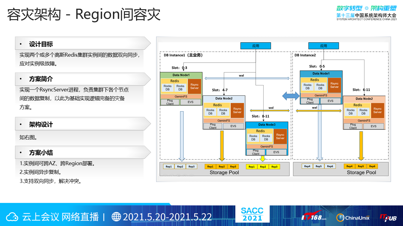 接下来继续讲跨Region级别的容灾。高斯Redis除了提供上述3AZ的强一致方案以外,还提供跨Region级别的容灾,也就是两个实例间的异步容灾。这套方案里,我们增加了一个Rsync-Server的模块,用来订阅主实例上新增的日志,再把日志反解编码成相应的格式,转发给对端的备实例,由备实例回放即可。这套方案,可以实现双向同步、断点续传、冲突解决等等。其中冲突解决,针对不同的Redis数据结构,采用不同的解决算法,保障最终一致性。