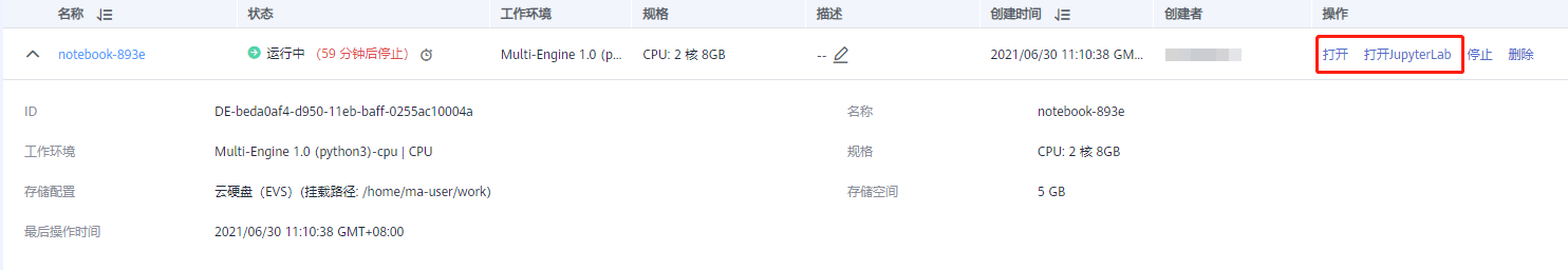 点击"打开",使用的是 jupyter notebook。