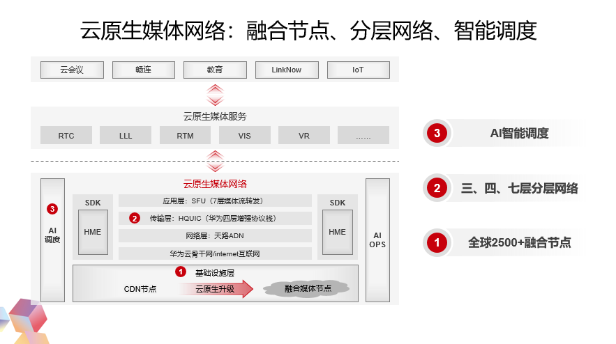 为了解决“来不及”、“用不起”这样的问题,华为云提出了云原生的媒体网络,我们认为云原生的媒体网络应该有三个特征:融合的媒体节点;三、四、七层分层网络传输优化;AI的智能调度。