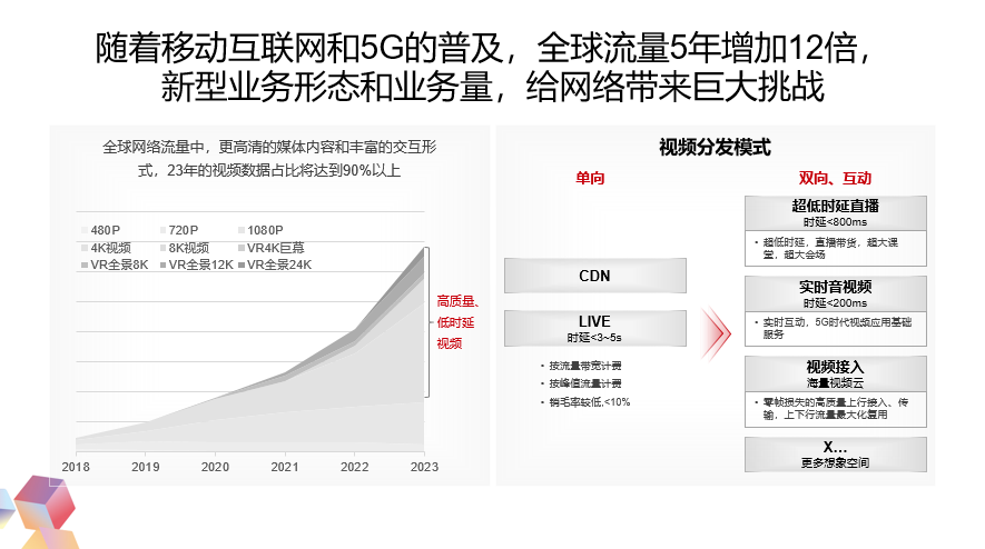 在过去的几年中,我们看到随着移动互联网还有5G的进步,全球的流量尤其是视频的流量5年内增加了12倍。我们看到很多1080p、4k、8k、VR的视频,使得网络的流量和带宽迅速撑爆。
