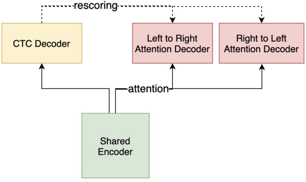 WeNet提供的解码器定义在TorchAsrDecoder类中。如图3所示,WeNet支持双向解码,即叠加从左往右解码和从右往左解码的结果。在CTC beam search之后,用户还可以选择进行attention重打分。