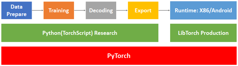 WeNet是一款开源端到端ASR工具包,它与ESPnet等开源语音项目相比,最大的优势在于提供了从训练到部署的一整套工具链,使ASR服务的工业落地更加简单。如图1所示,WeNet工具包完全依赖于PyTorch生态:使用TorchScript进行模型开发,使用Torchaudio进行动态特征提取,使用DistributedDataParallel进行分布式训练,使用torch JIT(Just In Time)进行模型导出,使用LibTorch作为生产环境运行时。本系列将对WeNet云端推理部署代码进行解析。