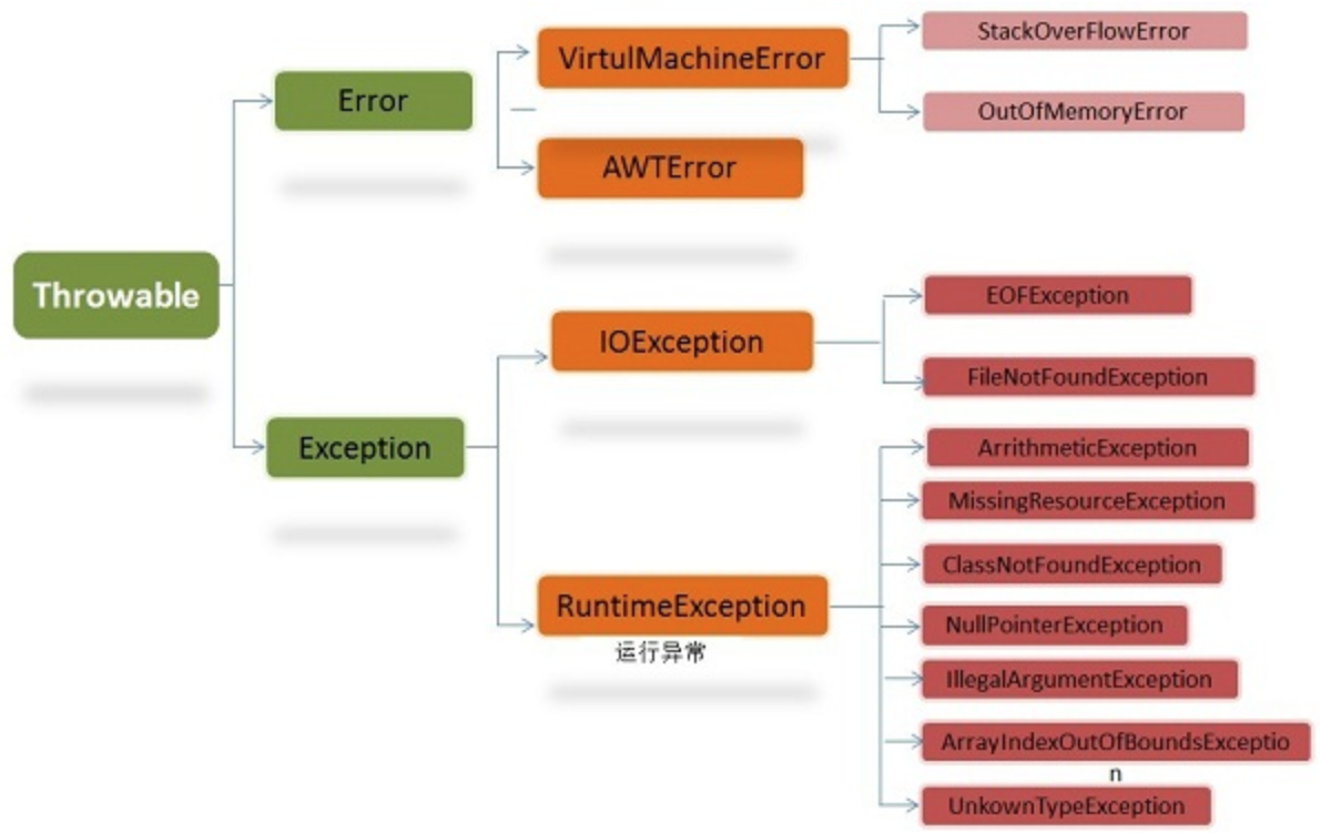 Throwable: 有两个重要的子类:Exception(异常)和 Error(错误),二者都是 Java 异常处理的重要子类,各自都包含大量子类。