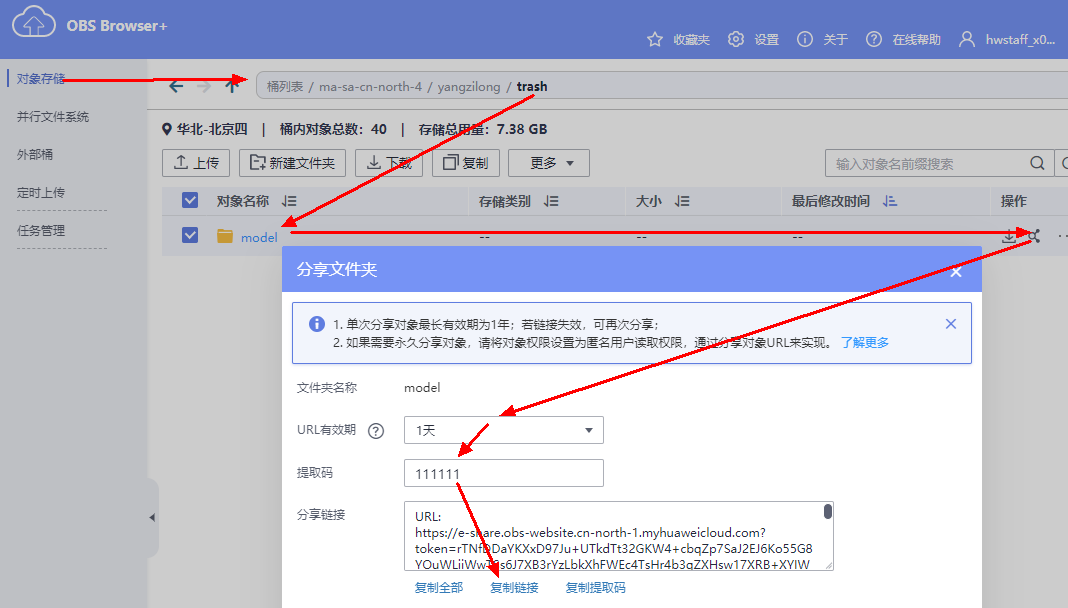 通过console可以获取18h有效地链接,通过obs browser可以获取任意时长有效的链接。obs browser的分享操作如下图。