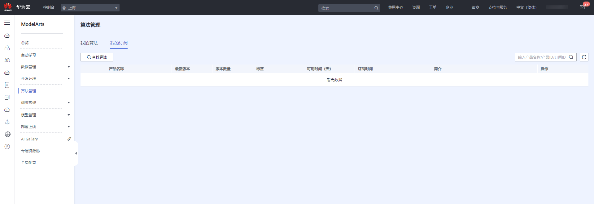 首先,我们进入华为云ModelArts云服务,进入算法管理,然后选择我的订阅,可以看到这里是没有订阅的算法的。