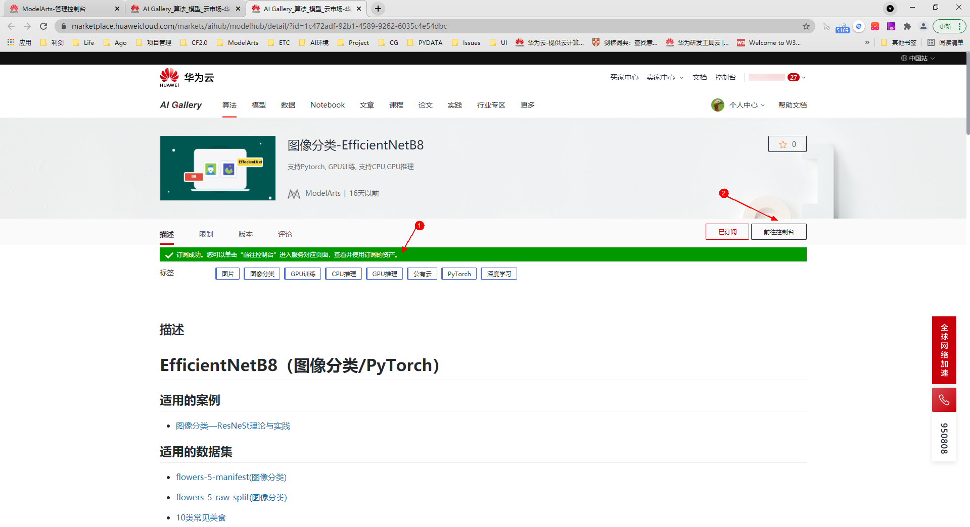 我们可以看到订阅成功的提示,然后点击前往控制台(Go to ModelArts),
