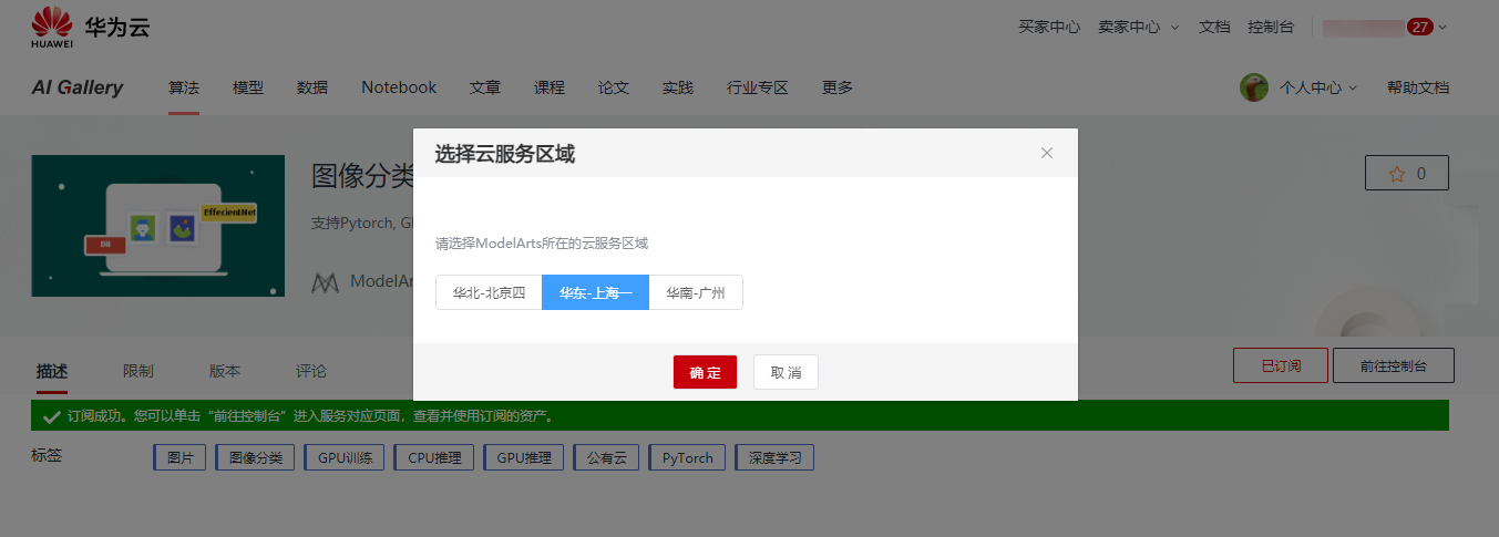 然后选择对应的节点并点击确认,回到ModelArts会自动选中对应的订阅算法,如下所示