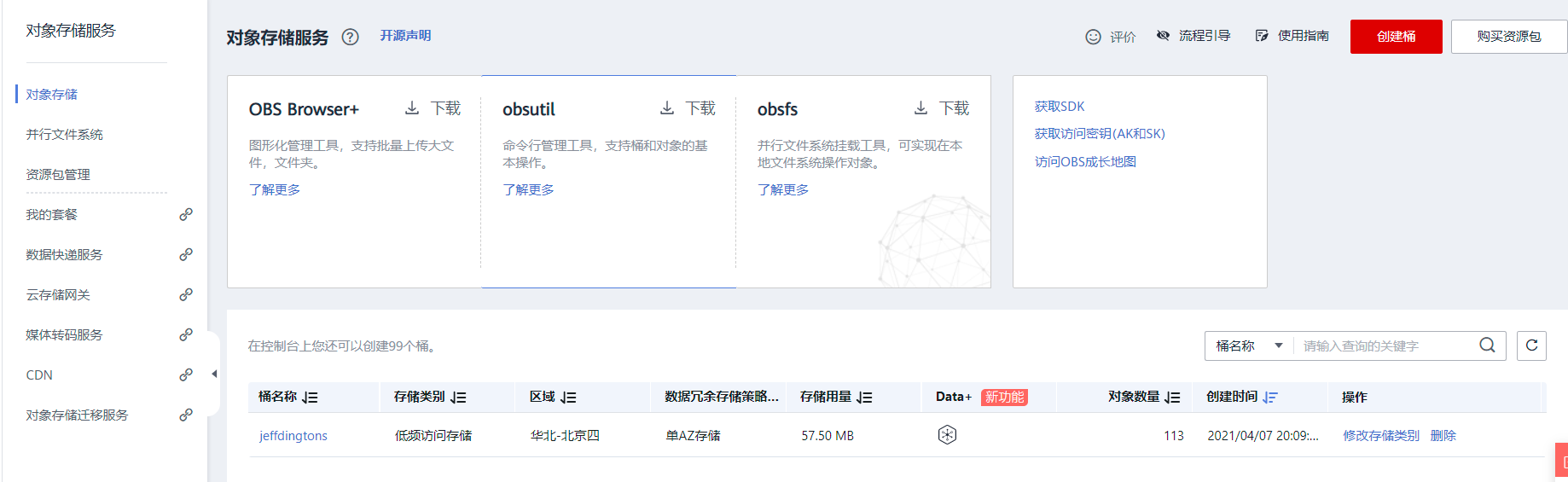 进入OBS主页:https://console.huaweicloud.cn/console/?region=cn-north-4&locale=zh-cn#/obs/manager/buckets