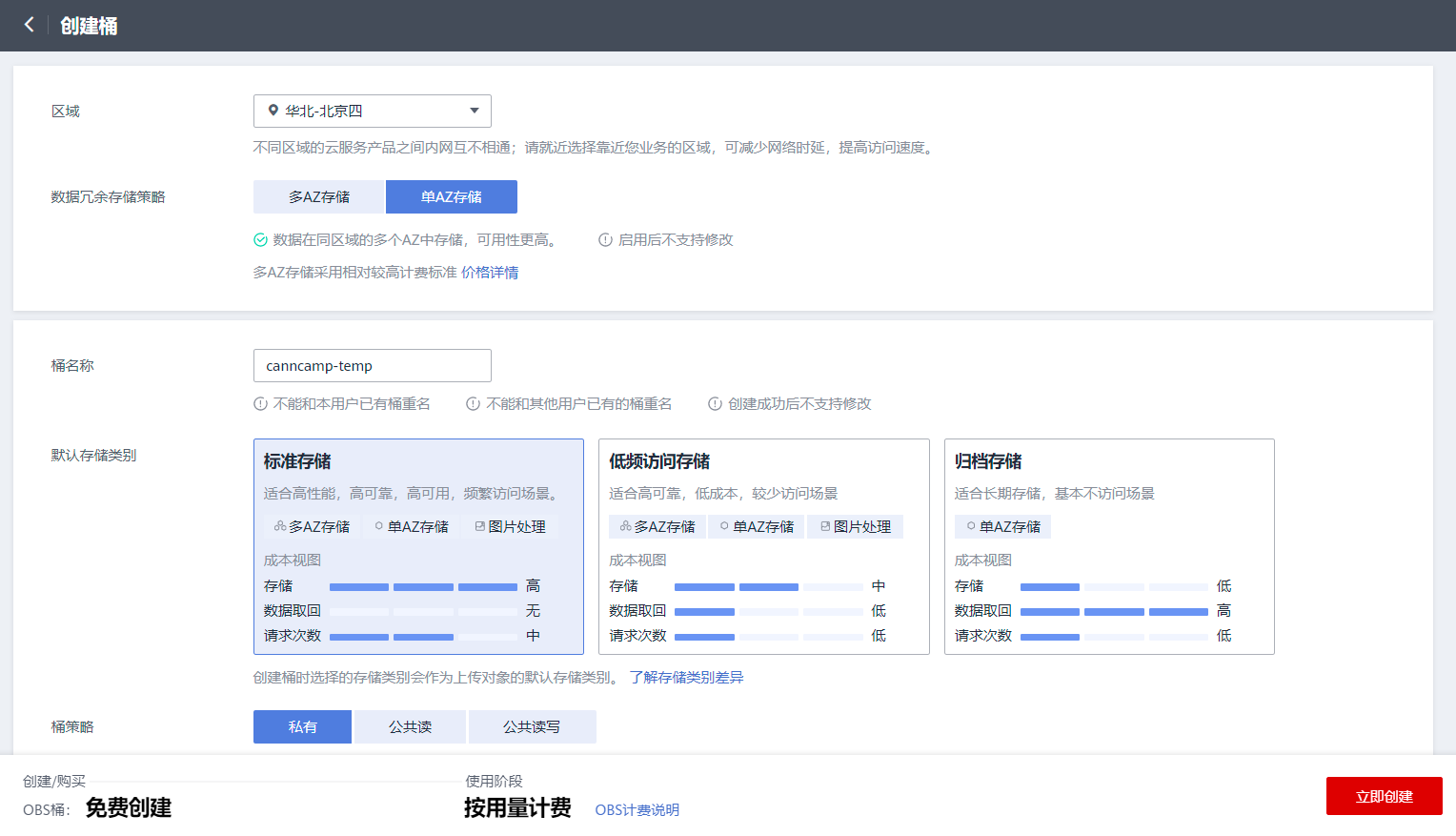 点击页面右上方的创建桶,随后在出来的页面中【数据荣誉存储策略】选择【单AZ存储】,【桶名称】位置填写一个桶的名字,自定义,只要不重复就行,重复会有提示,全都填写完成后点击,页面右下角的【立即创建】就完成了桶的创建工作